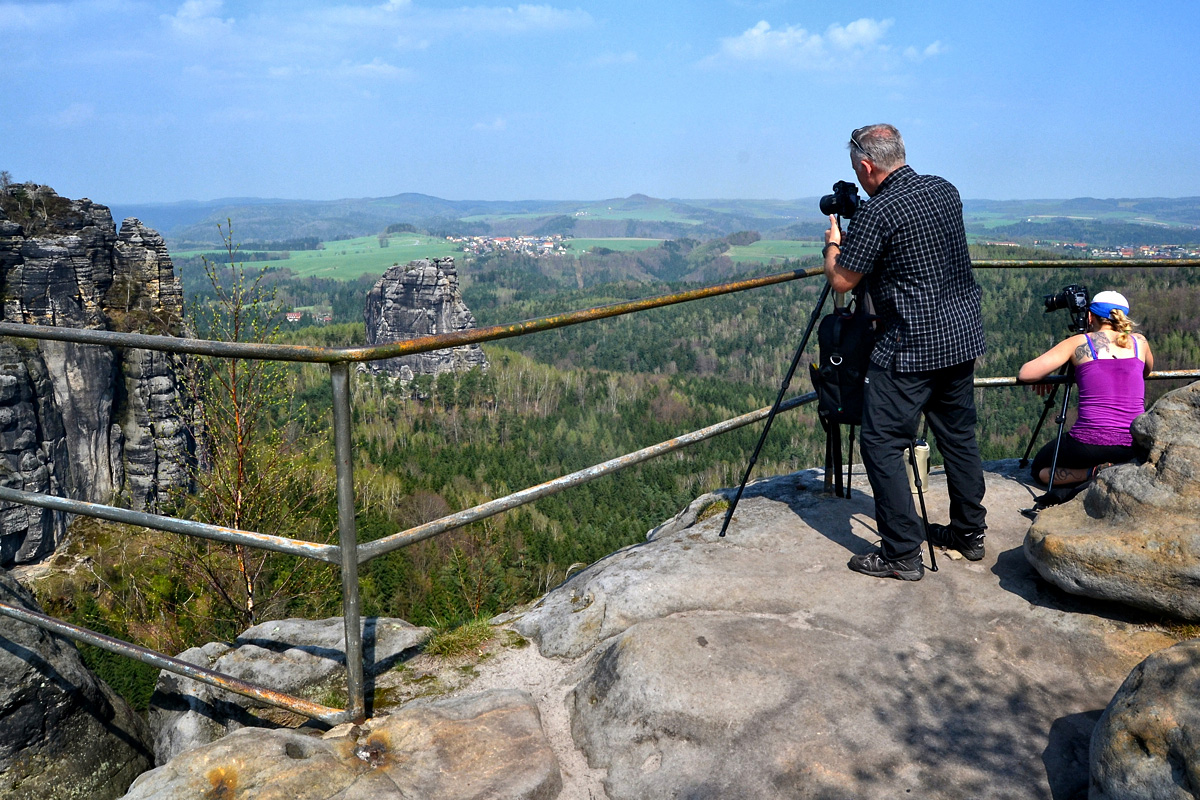 Weiter ging es dann Richtung Schrammtor. Nach der Passage dieser immer wieder eindrucksvollen Sandsteintürme lief ich bis zum Jägersteig, um hinauf zur Schrammsteinaussicht (417m) zu gelangen. Sonnenschein nebst Schäfchenwolken und nicht all zu viele Leute erwarteten mich dort oben – ein schöner Flecken um zu pausieren und das Panorama zu genießen.