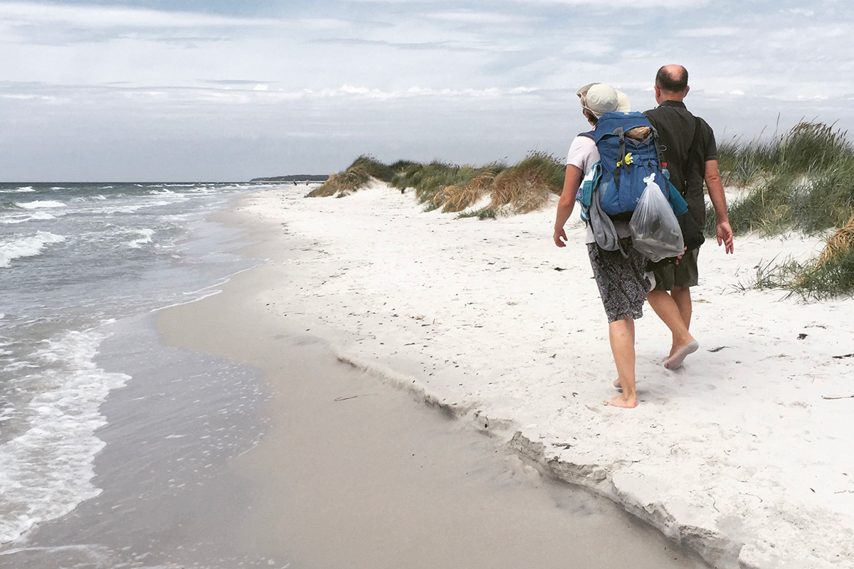 Dueodde. Der Sandtrand an der Südostspitze Bornholms. Der Name bedeutet Taubenspitze oder Taubenort. Mit Blick auf die sonst felsigen Küsten der Insel sind die weiten Sandflächen schon etwas Besonderes. Die Landschaft steht unter Naturschutz und wird den freien Kräften der Natur überlassen.