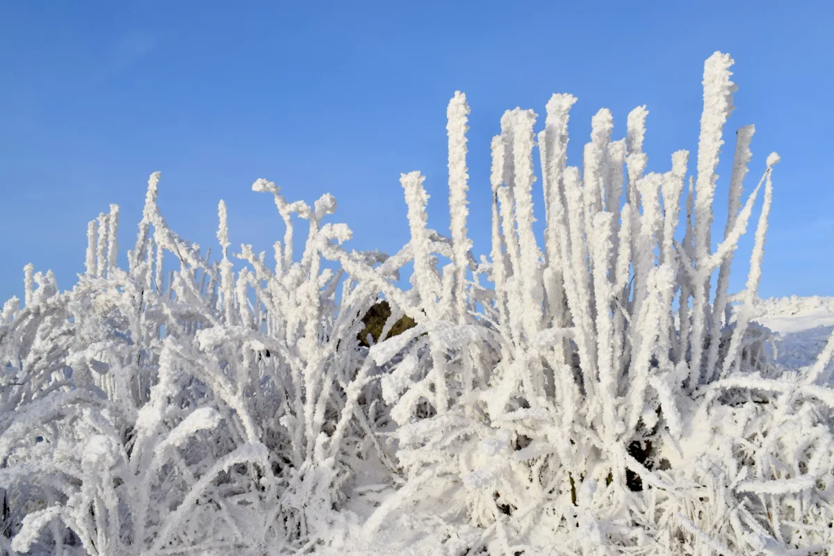 Viel Eis, zahlreiche Zapfen an den Felsen und auch an den Wasserläufen, wie etwa hier am Steinhüttenborn. An einer Gabelung halte ich mich rechts, quere die Brücke und wandere nun das das Fuchsbachtal hinauf. Die nächste Kreuzung, etwa einen Kilometer darauf. Rechts führt Mathens Hohlweg aus dem Tal hinaus und auf die Höhe hinauf.