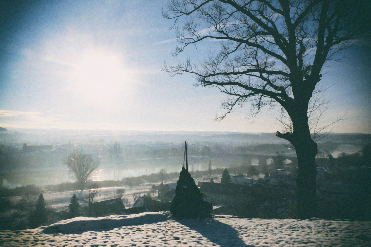 Immerhin, die historischen Gemäuer stehen noch und sind zu bestaunen, und auch der jetzt zugefrorene Mühlteich erfreut den einsamen Wandersmann. Letzter Höhepunkt dieser Wanderung ist der Zuckerhut, eine Felsnase am Elbhang bei Hosterwitz - mit Bank und schönem Panorama. Von der Keppmühle führt ein angenehmer Pfad dorthin, zuerst am Hang hinauf und dann weiter am Feldrand.