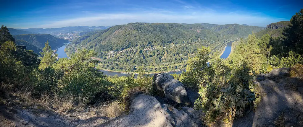 Der Weg zum Rosenkamm, also Richtung Elbtal, ist ausgewiesen. Er verläuft kurz im offenen Gelände und danach im Wald, welcher gestern ein schöner, sonnenlichtdurchfluteter Mischwald war. Mit dem Spálenisko (391 m), einem markanten Aussichtspunkt am Elbhang (mit Sendemast) ist der erste Höhepunkt der Wanderung alsbald erreicht. Von diesem ergibt sich ein bemerkenswerter Ausblick auf den Elbbogen bei Děčín – es galt daher zu verweilen und Ausschau zu halten.