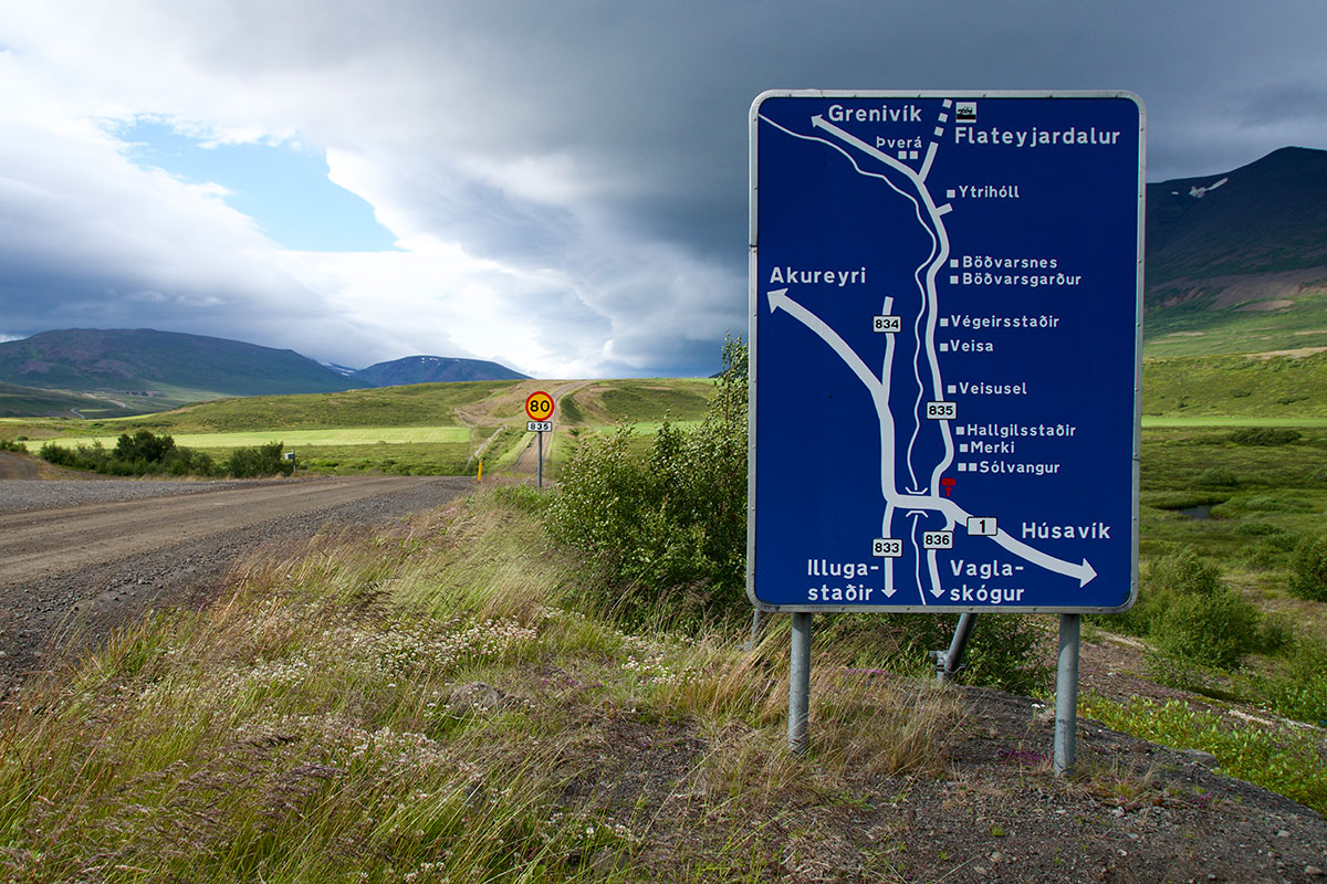 Das heutige Bild zeigt einen Abzweig von der Hringvegur, diesmal im Nordwesten der Insel. Beim Verlassen der Ringstraße helfen oftmals (aber nicht immer) diese netten Informationsschilder bei der Orientierung. Wohl dem, der über eine schnelle Auffassungsgabe und ein fotografisches Gedächtnis verfügt …