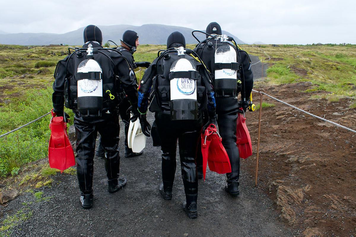 Das heutige Bild zeigt vier Menschen nach einem Tauchgang in der Silfra-Spalte. Sie erinnern sich gewiß: Der Nationalpark Thingvellir, man kann dort (inzwischen nur noch nach Voranmeldung) in der Spalte zwischen den beiden Kontinenten Amerika und Eurasien tauchen.