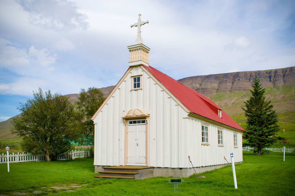 Auf Wunsch schließt sie die Kirche auf und erzählt deren Geschichte, insbesondere die des dort zu bewundernden Altargemäldes aus Alabaster, das zwischenzeitlich auch einmal im Museum in Reykjavík zu finden war.