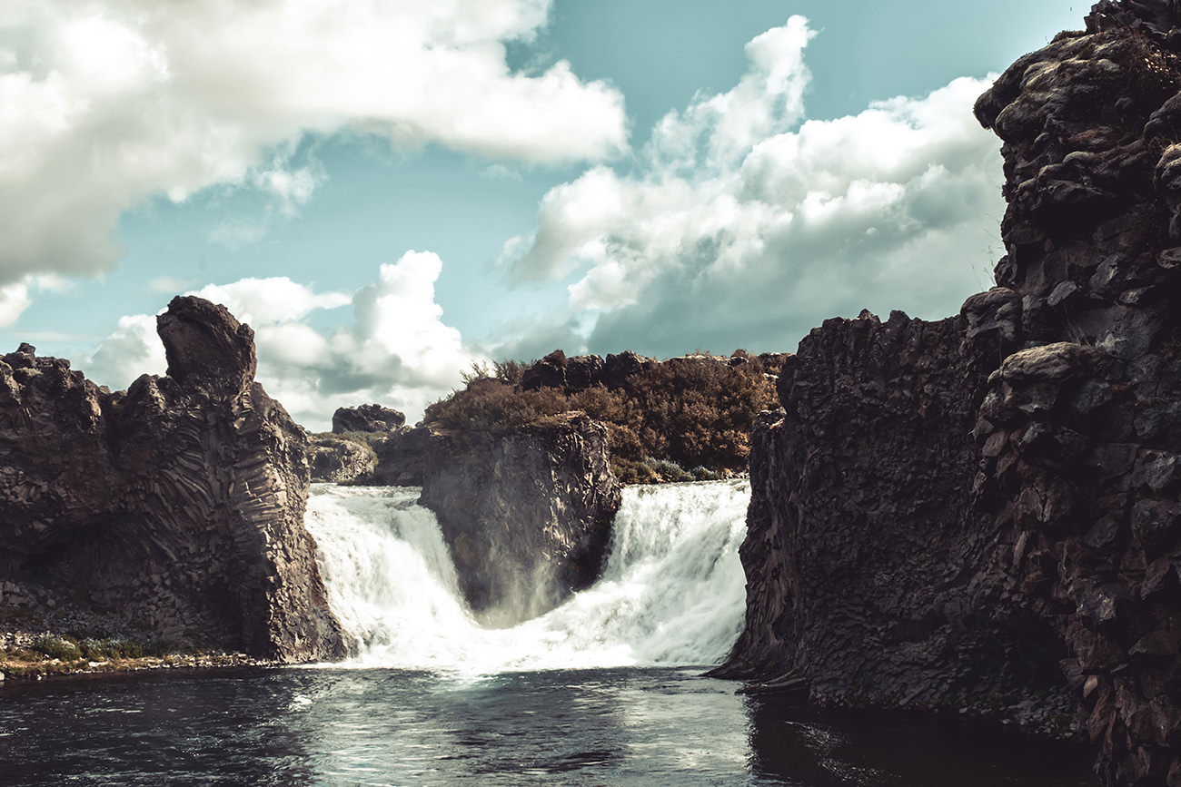 Das heutige Bild zeigt mit dem Hjálparfoss einen der schönsten Wasserfälle Islands. Die Wasser des Flusses stürzen über bizarr geformte Basaltsäulen in gleich zwei Kaskaden in die Tiefe (ca. neun Meter). Grund dafür ist eine kleine Basaltinsel, die den Flusslauf kurz zuvor in zwei Arme teilt.