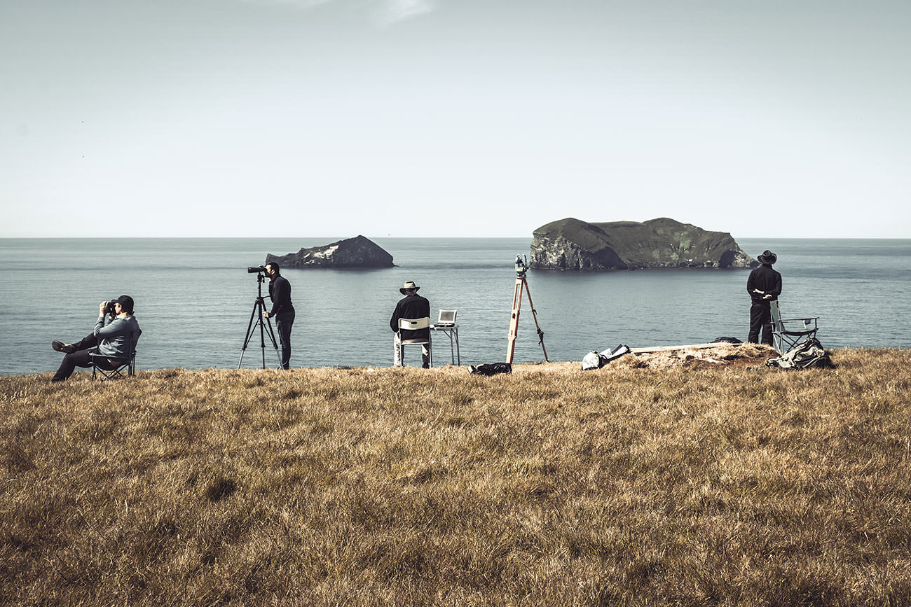 Das heutige Bild zeigt vier Männer, die aufs Wasser starren. Standort ist die steil abfallende Westküste der größten und einzig ständig bewohnten Insel der Westmännerinseln (Vestmannaeyjar). Die genaue Tätigkeit der Männer, die dazumal schweigsam und verschlossen das Meer im Auge behielten (hier also den Atlantischen Ozean), erschloss sich vor Ort nicht – wir tippten allerdings auf ein Quartett von Ornithologen (die Westmänner-Inseln sind für ihre zahlreichen Seevogelarten bekannt).