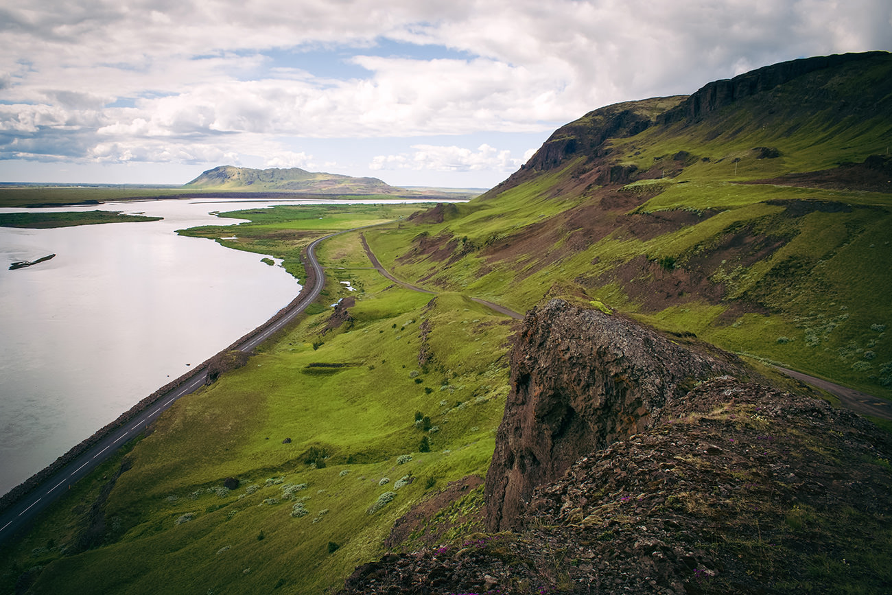 Das heutige Bild zeigt eine Landschaft im grünen Süden Islands. Wir waren mittendrin im Golden Circle und besuchten an diesem Tag gleich drei Wasserfälle: den Hjálparfoss, den Merkjárfoss und zuletzt den Seljalandsfoss. Entlang der Route eröffneten sich immer wieder spannende Blicke auf die umliegenden Gipfel und wenn es machbar war (man kann in Island nicht einfach so am Straßenrand halten), hielten wir an und bestiegen die Hügel, um über das Land zu schauen und Bilder wie das obige zu schießen.