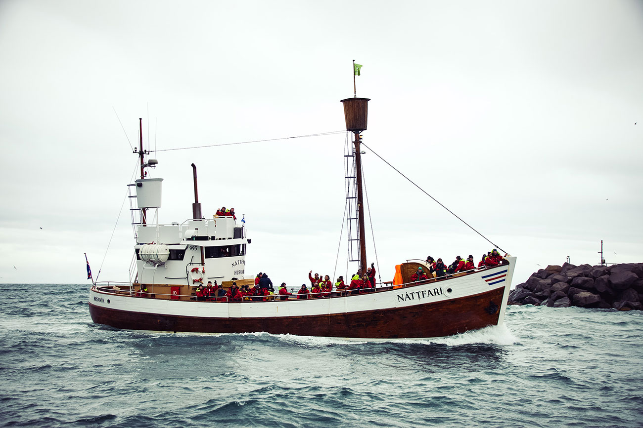 Das heutige Bild zeigt uns ein Whale-Watching-Boot mit offensichtlich gut gelaunten Touristen. Aufgenommen wurde es in Húsavík, ganz oben im Norden von Island. Wir haben es ihnen später gleichgetan und sind ebenfalls (dann auf einem anderen Kutter) in die Skjálfandi-Bucht hinausgefahren, um Wale und (tanzende!) Delfine (aus der gebotenen Distanz) zu beobachten.
