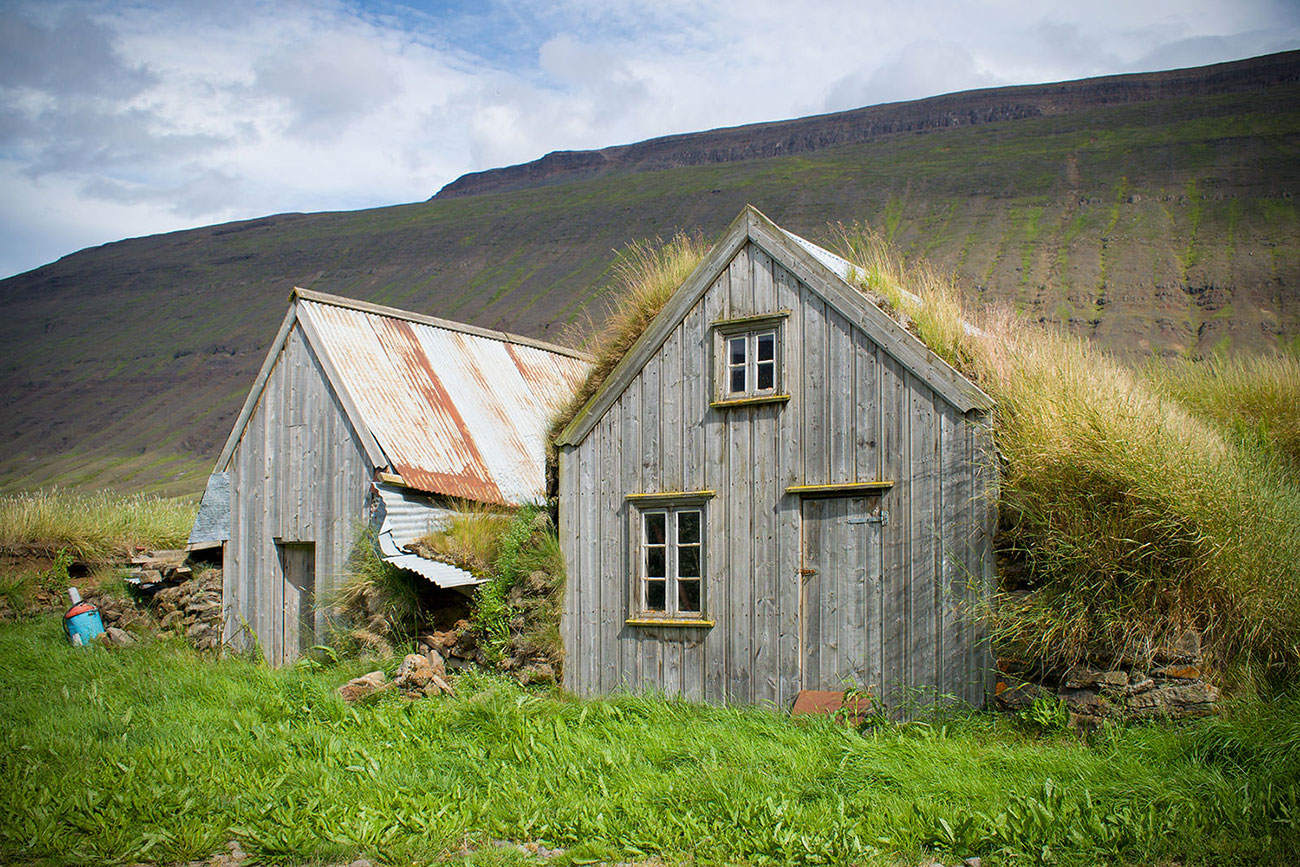 Das heutige Bild zeigt zwei alte, ehemals mit Grasoden gedeckte Plaggenhütten auf einer verlassenen Farm, die in dem von schroffen und markanten Berghängen gerahmten Tal der Eyjafjarðará (nahe Akureyri, also ganz im Norden der Insel) zu finden ist.
