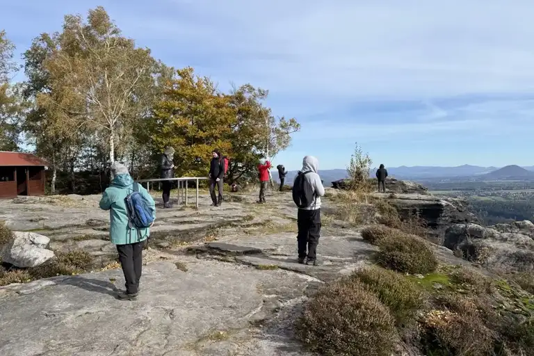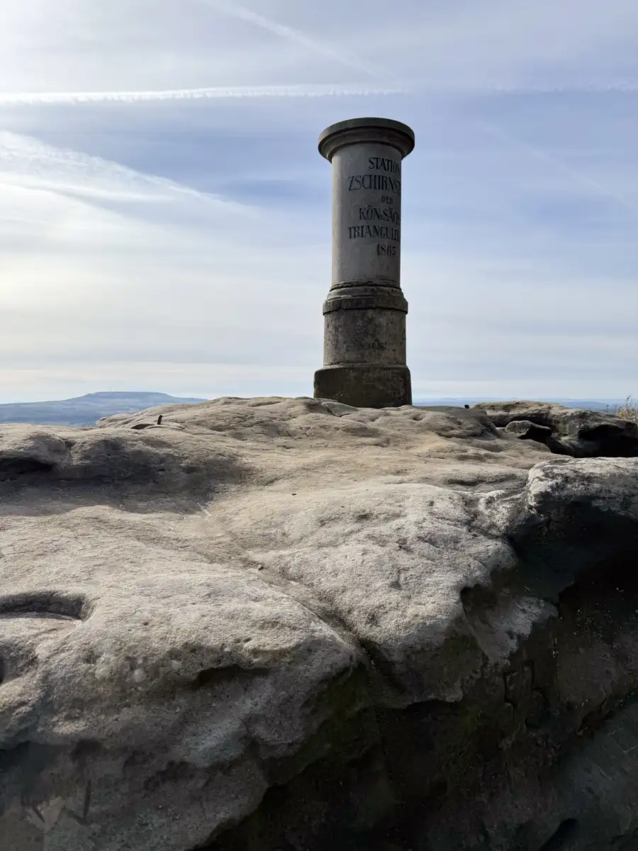 Wir waren schon oft vor Ort und folgten der üblichen Route. Also dem Wiesenweg, der uns aus dem Dorf hinaus und stetig bergan bis zum B-Flügel führte. Dieser brachte uns zur urigen Wildbretthöhle, an der sich die Stufen zum Aufstieg auf den Großen Zschirnstein finden. Auf schönem Weg liefen wir dann vor bis zur Aussicht, die am gestrigen Sonntag natürlich und erwartungsgemäß sehr gut besucht war.