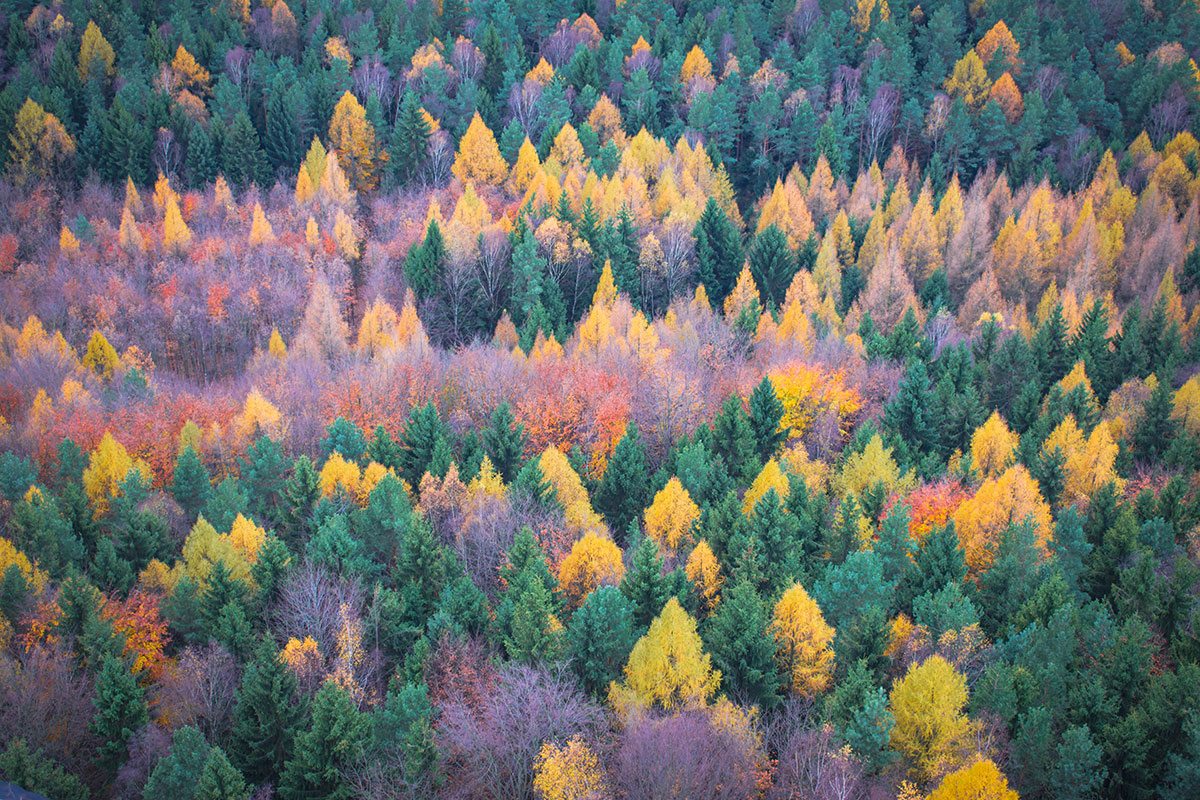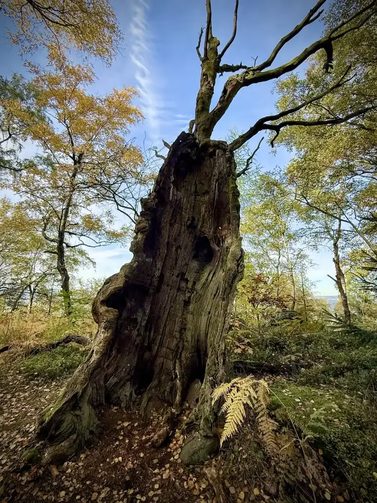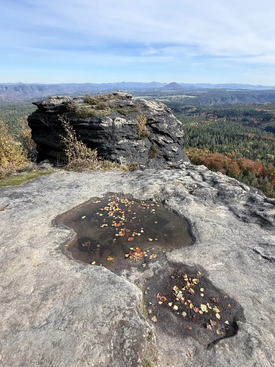 Die Sonne natürlich und der bunte Wald in den schillerndsten Farben. Die oftmals verspürte Ruhe und Stille im Busch. Der uralte Baum. Und der frische und ordentliche Wind, der an der Aussicht des Großen Steins das Laub vor sich her fegte.
