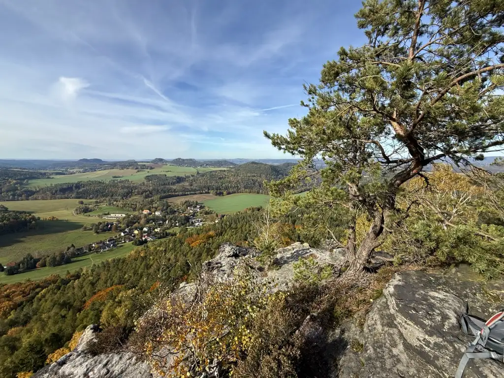 Nach kurzer Rast und tollen Ausblicken gen Osten gingen wir ein Stück zurück und erliefen den benachbarten Kleinen Zschirnstein, an dem es deutlich ruhiger und auch weniger windig war – wir nahmen dort sozusagen ein angenehmes Wald- und Sonnenbad mit doller Aussicht (hoch oben über den wie aufgereiht liegenden Orten und Tafelbergen). Danach folgten wir dem Riff bis zur alten und immer noch stehenden Opfereiche, nahmen diese in Augenschein (jemand hat einen neuen Eichenbaum nahebei gepflanzt) und gingen nach abermaligem Verweilen wieder hinunter. Zuletzt brachte uns der Hirschgrundweg nach Kleingießhübel zurück (komoot).