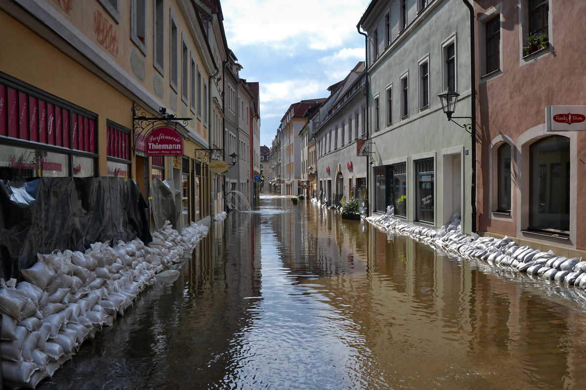 Zuvor hat es das Wasser allerdings noch geschafft, das Rathaus einzuschließen, und auch auf der anderen Seite der B172 wurden inzwischen Sandsackbarrikaden errichtet und es wird gepumpt – der Rückstau der Gottleuba tut hier sein Übriges. Wichtig: im Stadthaus am Markt (neben dem Fluthilfebüro) wurde heute mit der Auszahlung der Flutschäden-Soforthilfe an betroffene Menschen begonnen, welche dem Vernehmen nach schnell und unkompliziert erstattet wird.