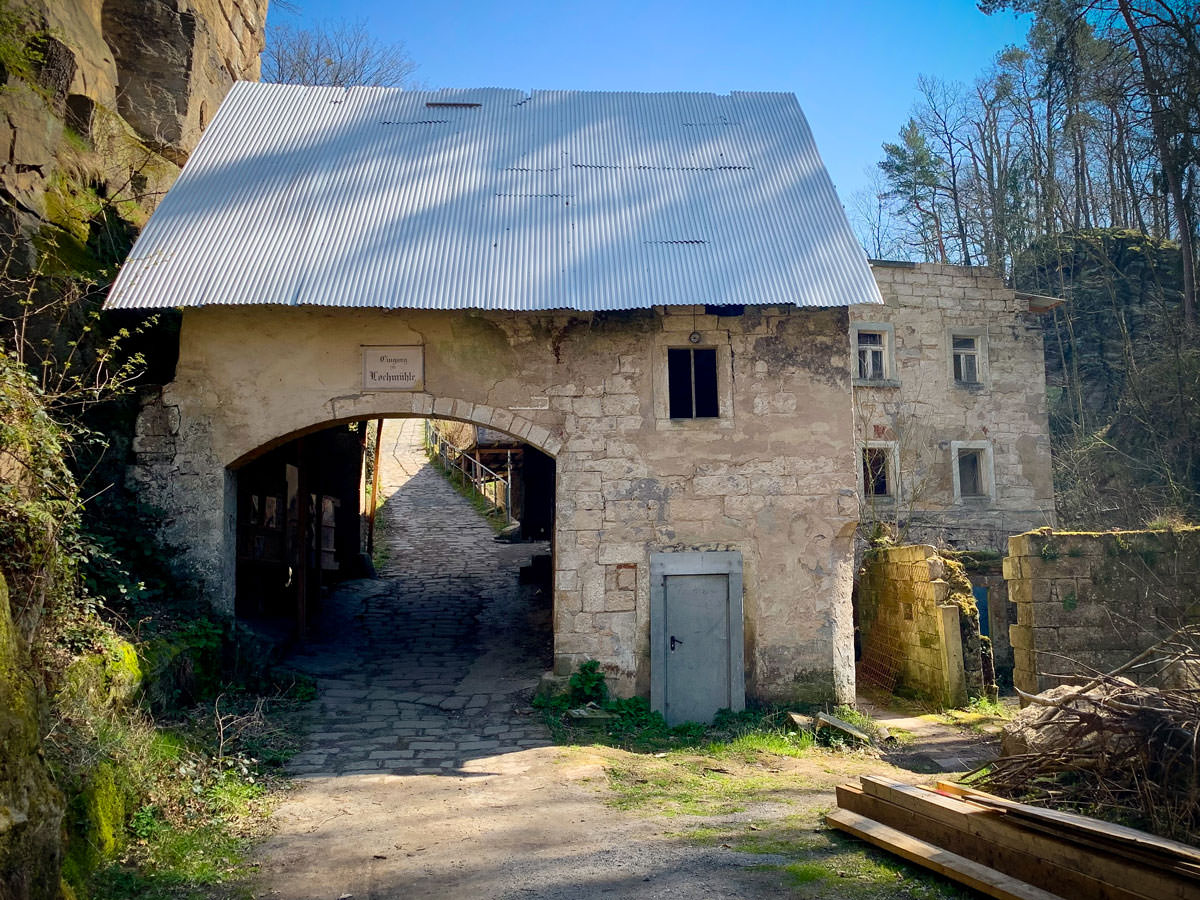 Und es war wie immer in diesem Grund – etwas unheimlich, düster und wildromantisch. Der grässliche, weltgrößte Wagner steht immer noch da, ebenso wie die Ruine der Lochmühle (es gibt eine Pforte im Bauzaun) und die des alten E-Werks.