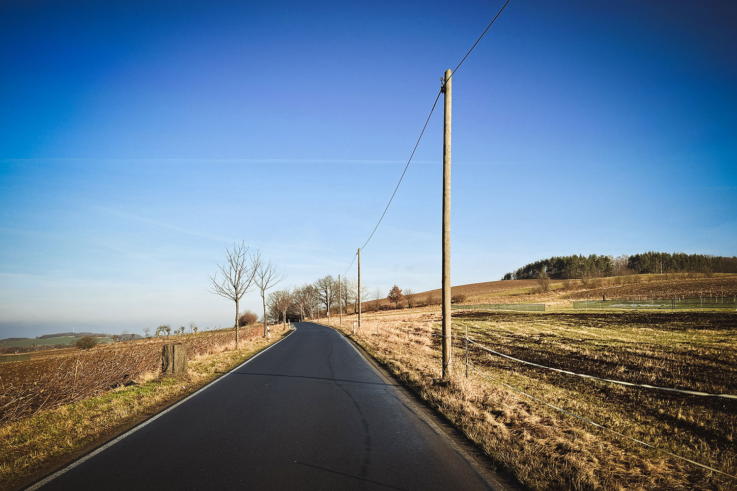 Was schön war: das Licht, die Sonne, der frische Wind. Nur ein Auto auf der Landstraße. Und die ruhigen, kaum begangenen Wege im offenen Land. (komoot)