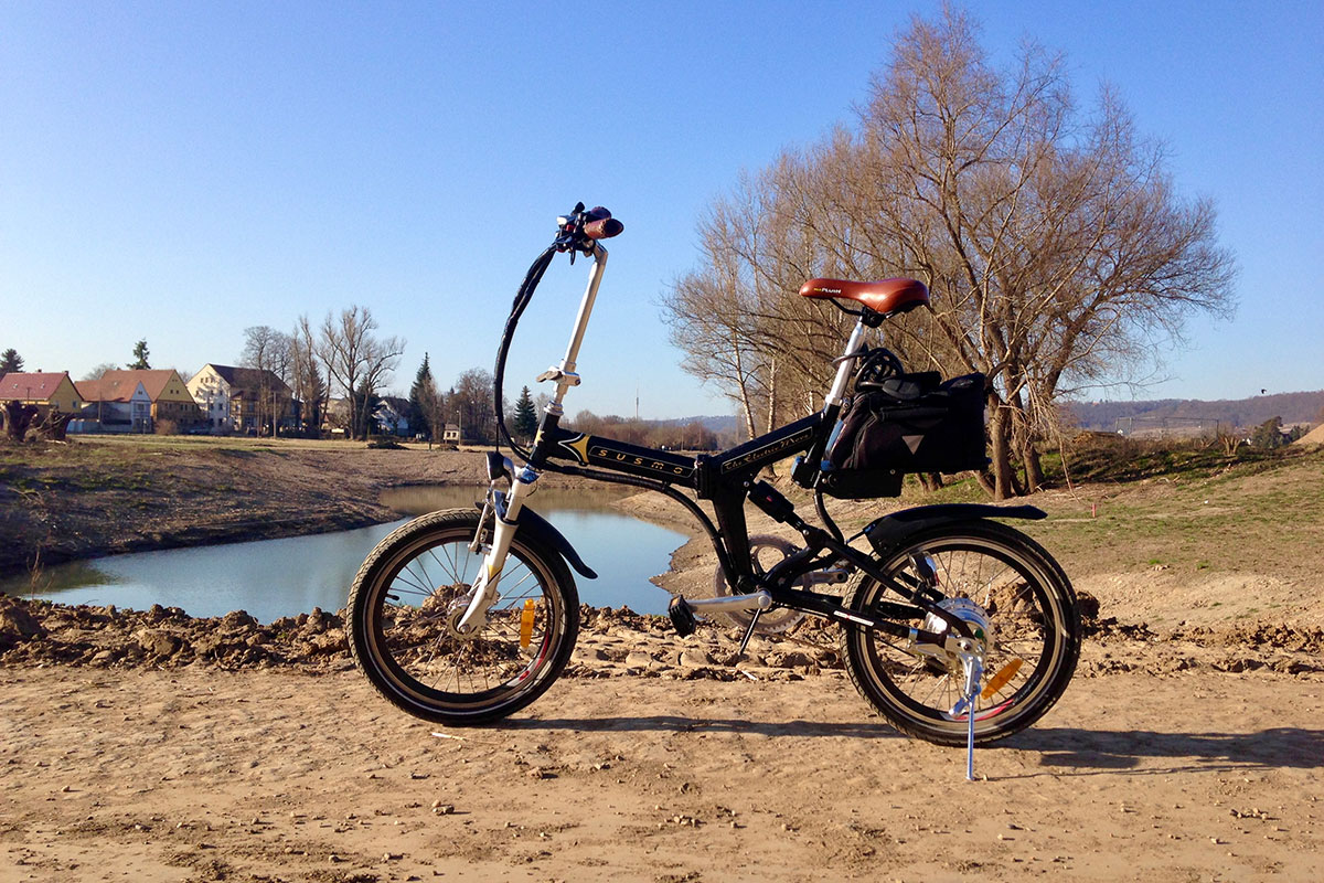 Noch kurz zu den technischen Daten. Die Rede ist von einem B1 36V Elektro-Klapprad. Es ist mit einem Radnabenmotor-Antrieb mit 250W Leistung ausgestattet. Den originalen, bereits nach einem Jahr schwächelnden 10 Ah Froschakku habe ich gegen einen 36V/11,6Ah Panasonic Lithiumakku ausgetauscht, der bei normaler Fahrweise eine Reichweite von 75 Kilometern verspricht. Danach braucht es sechs bis sieben Stunden, den Akku wiederaufzuladen.
