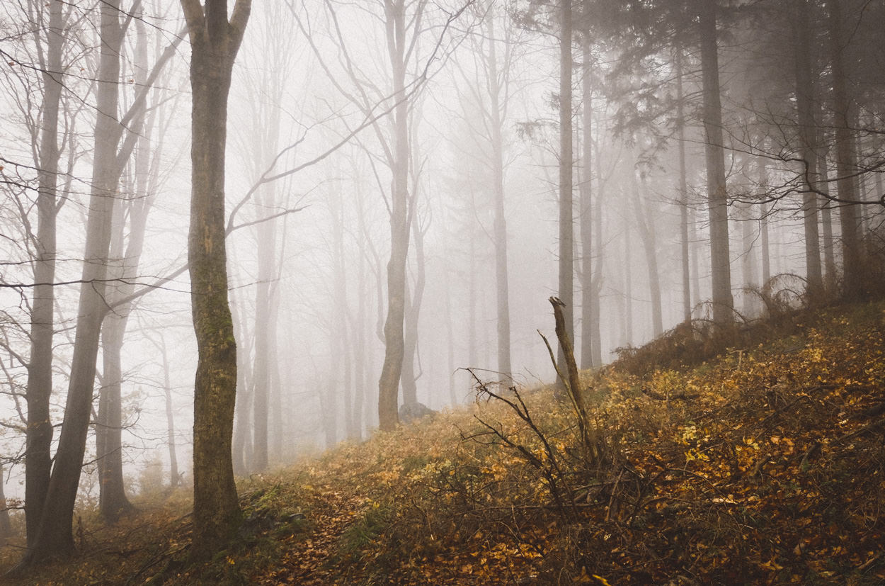 Die nahe Grenze zu Tschechien passierten wir am Eulenthor, liefen dann ein Stück die Straße nach Dečín, um alsbald (an der Krötenpfütze) in den Wald einzubiegen und dann schnell nach Snežník (Schneeberg) hineinzukommen. Je höher wir kamen, desto dichter wurde der Nebel …
