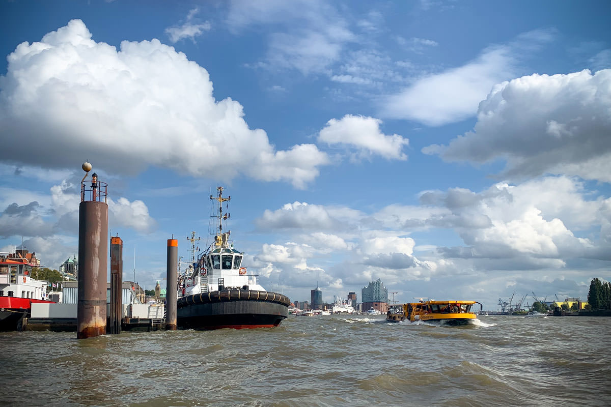 Von der Kleinstadt in die Metropole und der Fluß bleibt derselbe. Menschen treffen, den Kiez erkunden, bevor die Meute kommt, und ein Käffchen hier und ein Bierchen dort. Morgens die Elbe und abends die Elbe, der Hafen natürlich und zuerst die Barkasse und dann ein "Bügeleisen", da war es schon finster und wolkenverhangen und der Regen nahm zu. Die Lichter der Stadt waren trotzdem da, und, so allein auf dem Schiff, das hat was für sich. Der mensch muss auf dem Wasser sein – da geht es ihm gut.