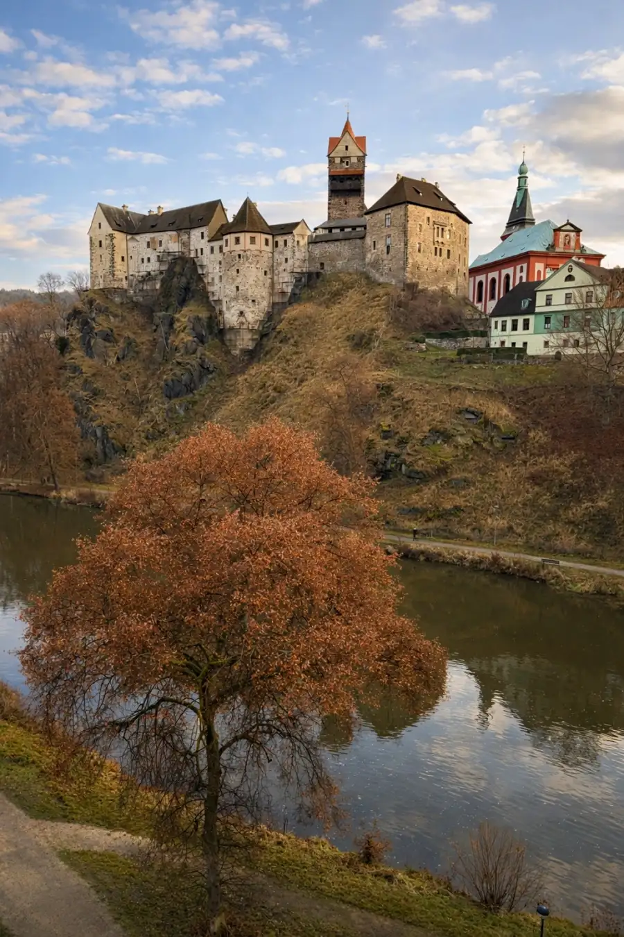 Elbogen (tschechisch Loket) ist ein ca. 3000 Seelen zählender Ort nahe Karlsbad. Die historische Altstadt (mit einer schönen mittelalterlichen Burg) steht unter Denkmalschutz und liegt majestätisch auf einem markanten Felsvorsprung, der auf drei Seiten von der Eger (tschech. Ohře) umgeben ist.