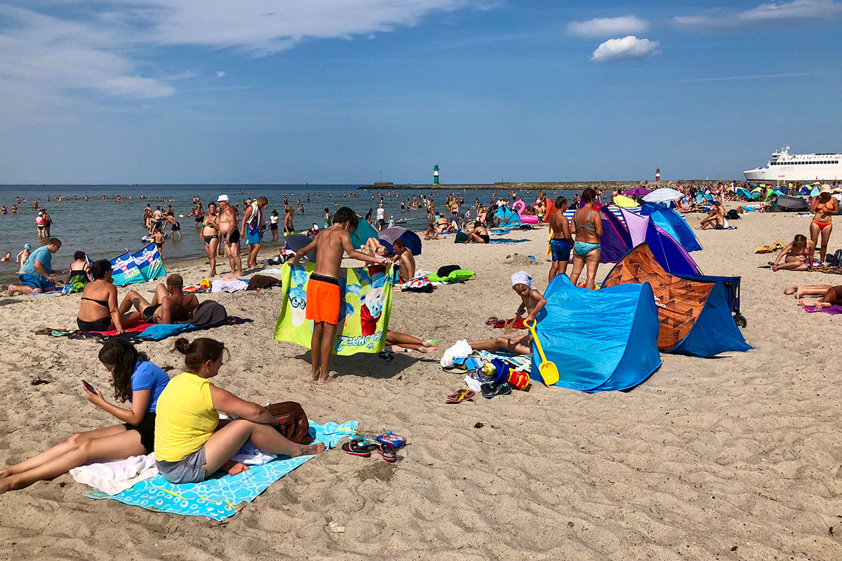 Am Strand. Sonne satt und der heiße Sand. Barfuss ging gar nicht. Dann das nicht enden wollende Bad im Baltischen Meer. 22 Grad misst die Ostsee vor Warnemünde. Schnell reinrennen ging gut.