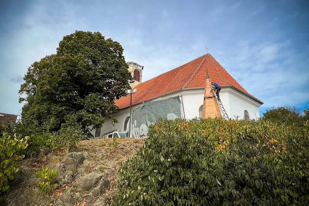 Dieses (Ende des 16. Jahrhunderts erbaute) Gotteshaus ist nicht leicht vor die Linse zu bekommen, weshalb ich es bei diesem einen Schnappschuss, der zudem die neu zu errichtende Turmspitze zeigt, belassen möchte. Bevor jemand fragt: Nein, auch der Blick ins Innere blieb uns verwehrt, das Kirchlein war allseits verriegelt und verrammelt.