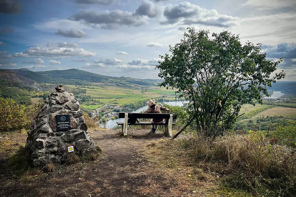 Wer mag, kehrt nach dem Blick auf das Gemäuer und den kleinen Friedhof in die Wirtschaft ein (gegenüber, einfache böhmische Küche und freundliche Bedienung, es geht so). Nächster Höhepunkt der Runde ist der Abstecher von Klein-Dubitz zur Doerell-Aussicht, die ihren Namen zu Ehren des Malers der Romantik Ernst Gustav Doerell trägt, der in unseren Tagen gerne als der „Maler des Böhmische Mittelgebirges und Erzgebirges“ benannt werden darf (er fand seine Motive vor Ort). Abermals schauen wir auf das Land und den Fluss, und abermals ist es ein ruhiger, herzallerliebster Ort zum Verweilen. Habe ich schon erwähnt, dass wir gestern all diese berühmten und historischen Orte ganz und gar für uns alleine hatten?