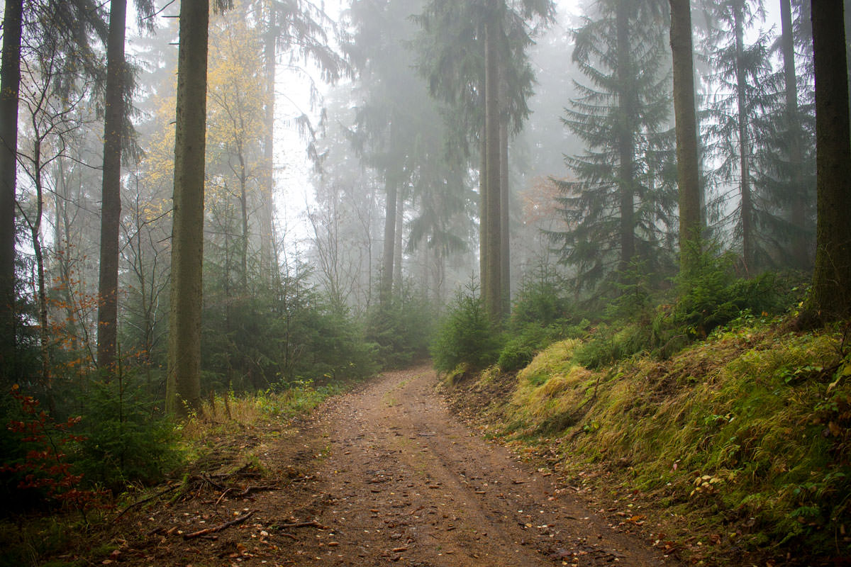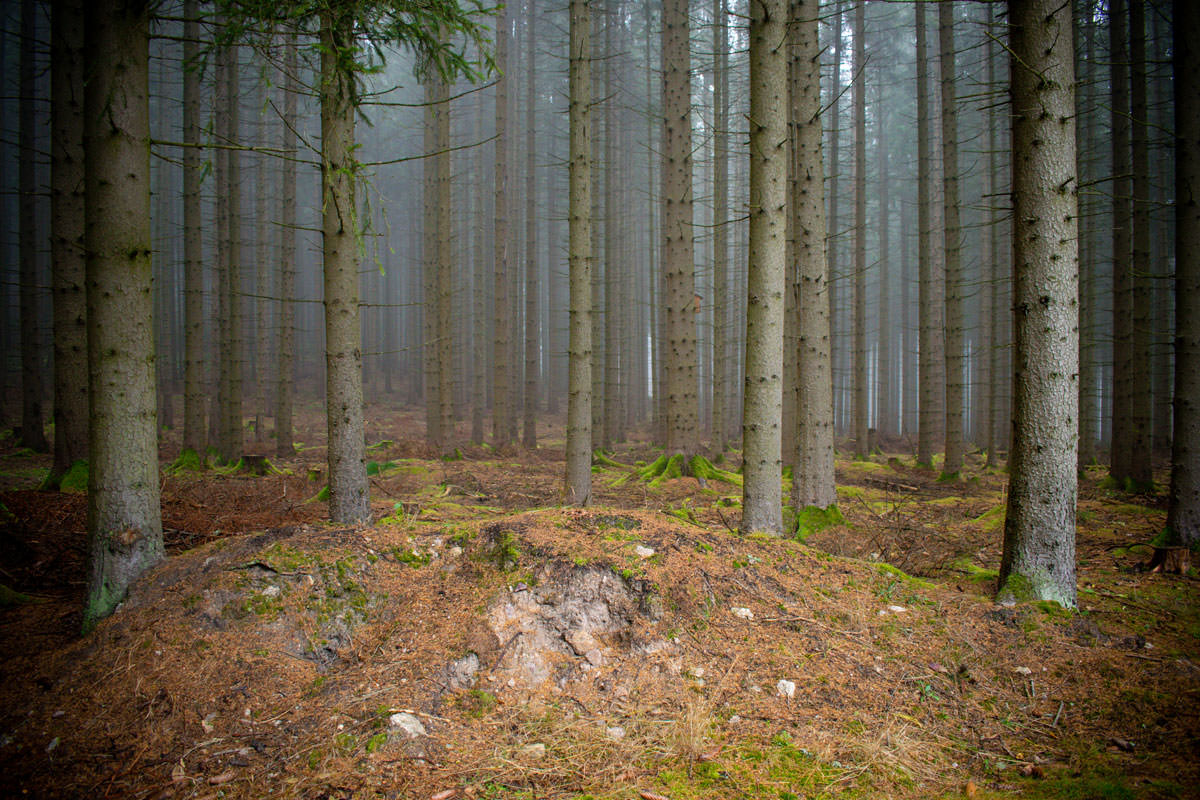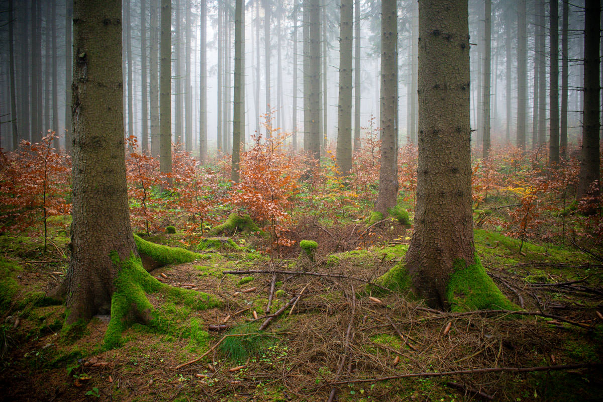 Nebelfeuchtes Nebelgrau, inmitten des Novembers. Die Wolken hängen tief und fest und der Wald ist einfach nur der Wald. Menschenleer und mucksmäuschenstill.