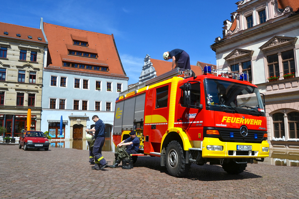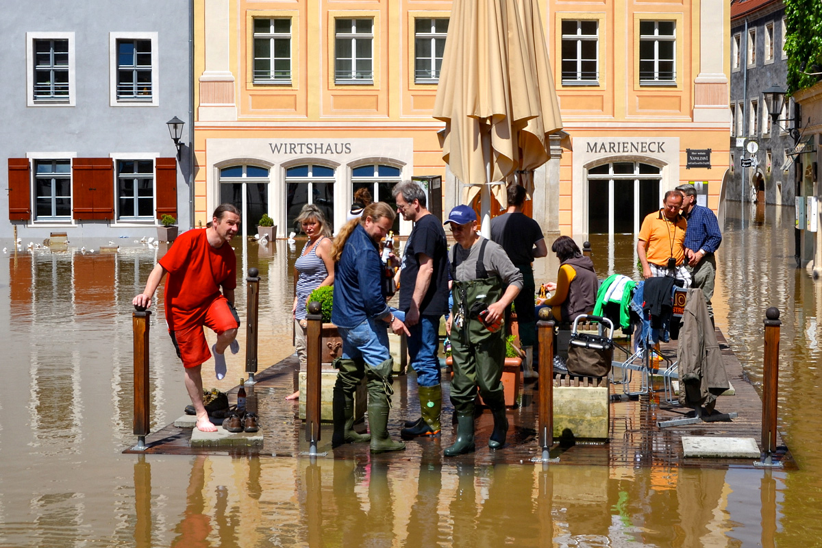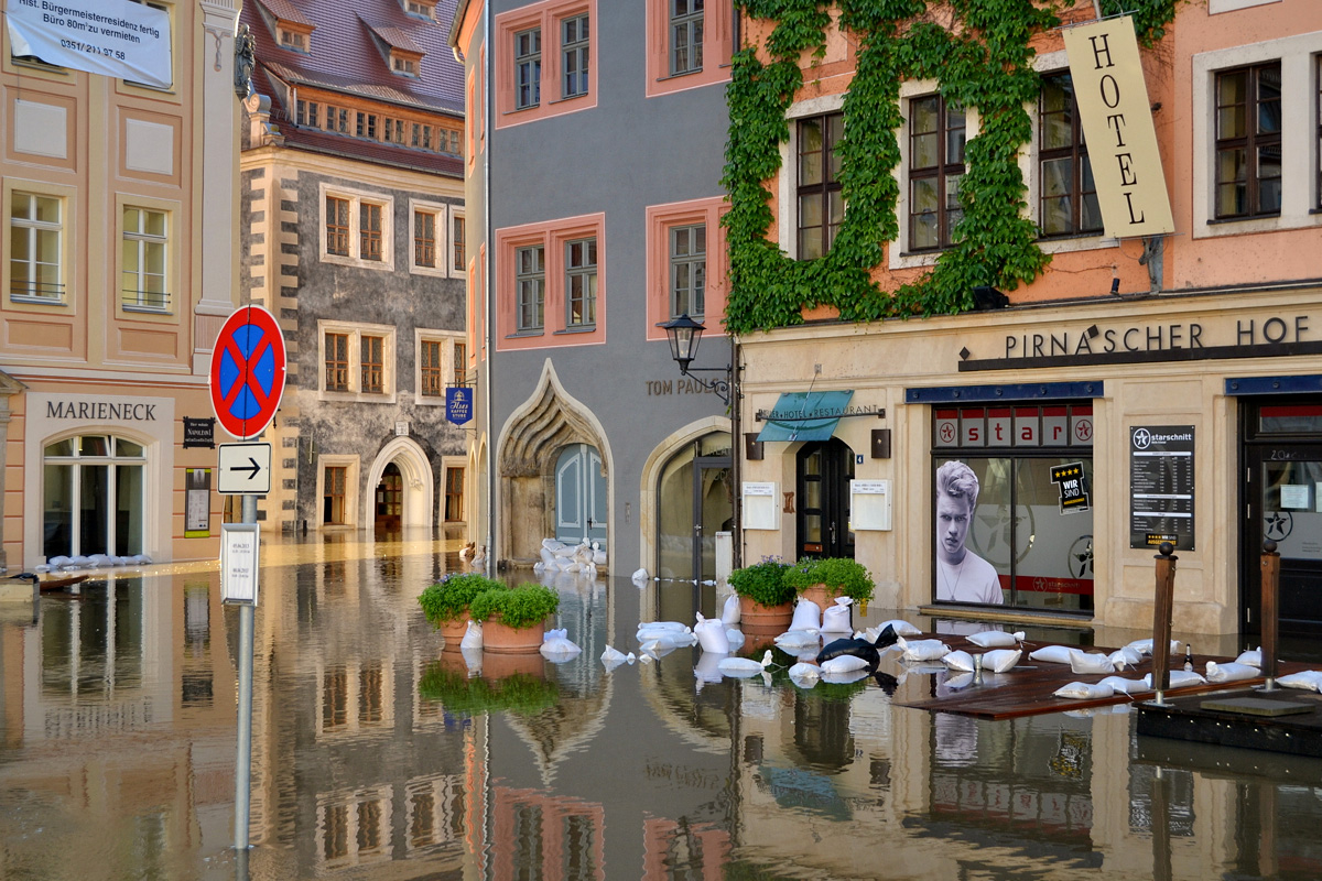 Die Stadt zählt 20.000 mittelbar und unmittelbar Betroffene im Pirnaer Stadtgebiet. 8.500 Menschen mussten evakuiert werden, 250 sind auf eigene Verantwortung in ihren Häusern verblieben (alles via Stadt-Info). Die Nachricht, dass die Prognose für den Pegelstand Schöna herabgesetzt wurde, sorgte für eine in der Stadt deutlich spürbare Erleichterung.