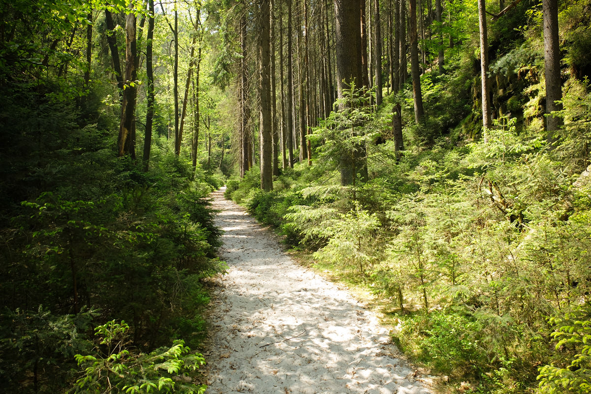 Das alte Forsthaus, im Hintergrund der Teichstein. Es steht unweit vom Zeughaus, einer Gastwirtschaft, die ab April wieder geöffnet hat. Zur Zeit ist dort natürlich alles dicht, der geneigte Wandersmann muss sich also aus dem Rucksack selbst versorgen. Weiter lief ich dann die bequem zu laufende Zschandstraße in das Tal des Großen Zschandes hinein.