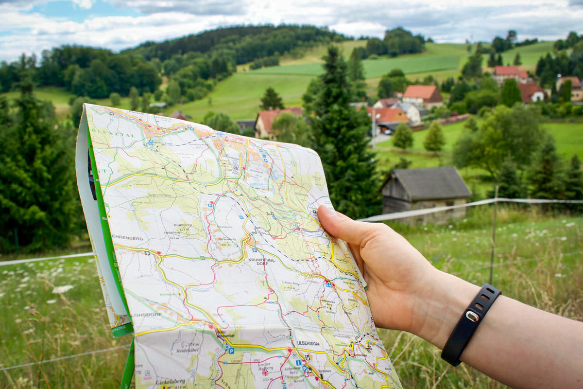 Wir starteten am oberen Ende von Ulbersdorf und liefen die Alte Geleitstraße bis Krumhermsdorf. Dort querten wir die Gleise und traten in den Wald ein, immer mit dem grünen Strich Richtung Unger. An einer Lichtung verabschiedete sich die Markierung leider ins Nirvana. Wir folgten zunächst einem zugewachsenen Pfad, später unserem Instinkt durch das dichte Unterholz. Kein Pfad, keine Wegzeichen. Mit dem Orientierungssinn klappt es aber noch ganz gut, denn schließlich trafen wir nur wenige Meter vom Gipfel wieder auf den Hauptweg (wenn auch arg zerkratzt und von Zecken geplagt).