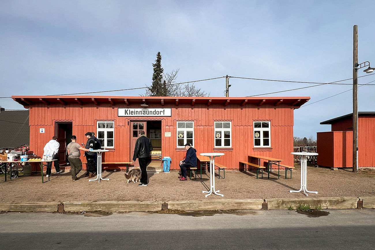 Bemerkenswert: Es war ein wunderschöner, milder und sonniger erster Frühlingstag. Die frühen Blümchen streckten sich der Sonne entgegen und das Federvolk zwitscherte vergnügt und aufgeregt durcheinander. Der nett ausgebaute alte Bahnhof in Kleinnaundorf wurde heute von Vereinsmenschen mit Speis und Trank belebt. Zudem traf ich auf einen freundlichen und älteren Herrn mit Hund, der für den Wiederaufbau der Arthur-Lohse-Brücke im Rabenauer Grund warb, und unterschrieb die das Anliegen unterstützende Petition.
