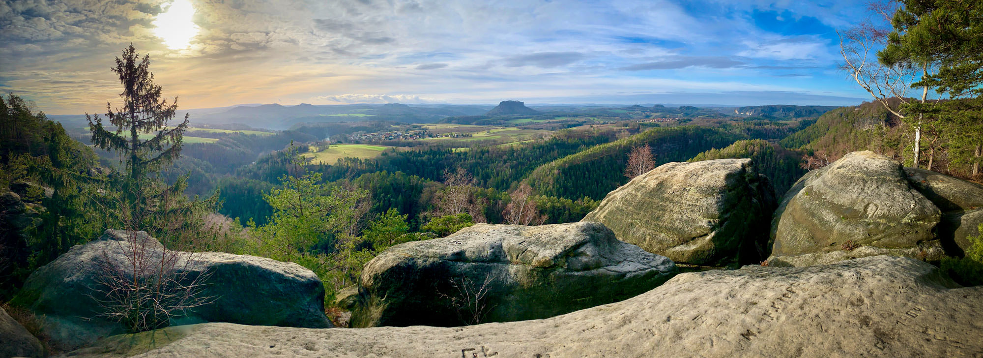 Oben wurde kurz verschnauft, um dann am Gasthaus vorbei und weiter Richtung Ochelwände zu gehen. Die Waitzdorfer Aussicht, als solche eine der besten und schönsten Aussichten des Elbsandsteins, ist ebenfalls gut ausgeschildert und alsbald erreicht. Wir waren allein, ließen uns nieder und genossen den Ausblick – bei Sonnenschein und Himmelblau.