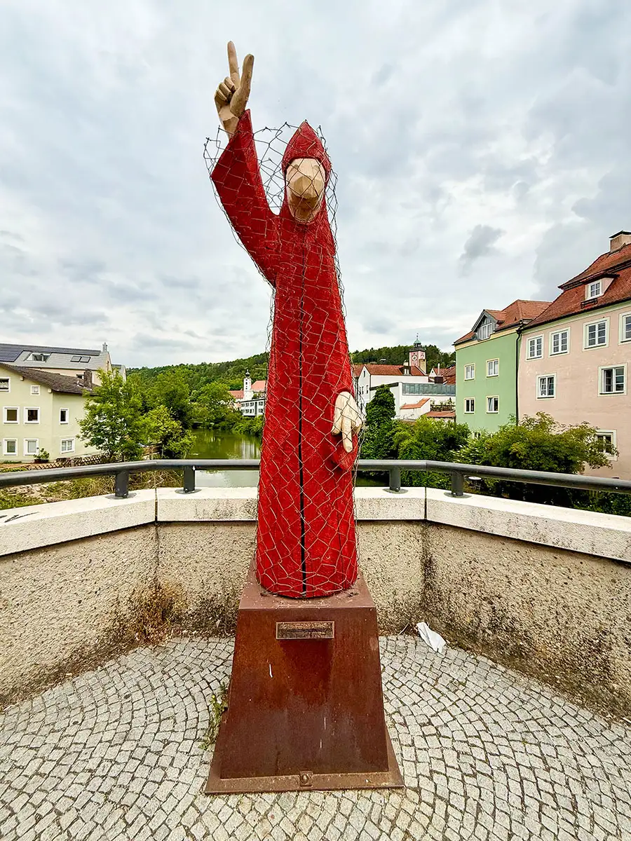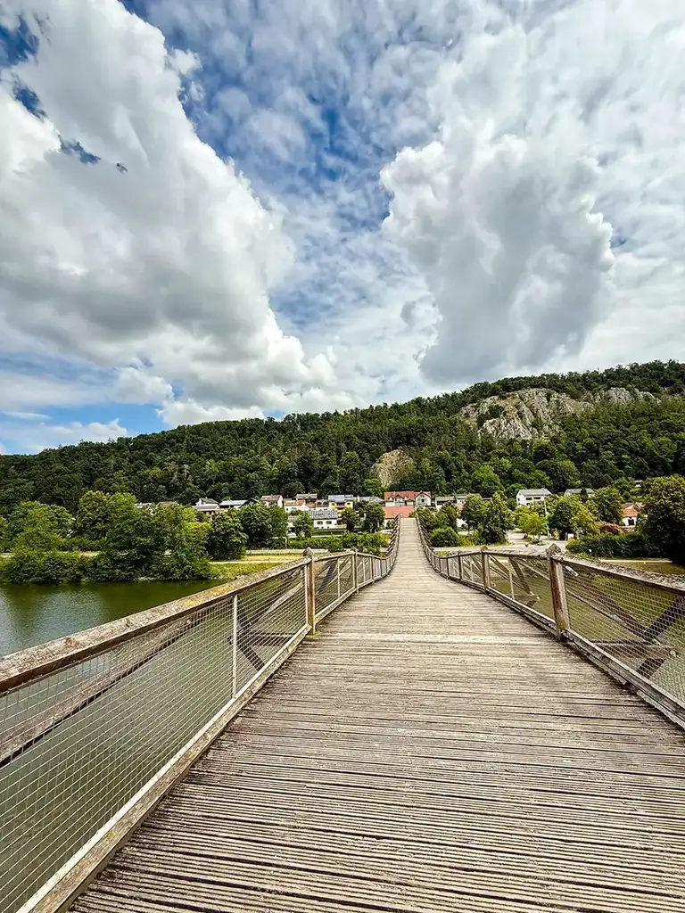 Wir packten und fuhren weiter nach Neuburg an der Donau. Unterwegs stoppten wir und erkundeten die sehenswerte Holzbrücke Tatzlwurm in Essing im Altmühltal, die mit ihren 193 Metern Länge zu den längsten Holzbrücken in Europa zählt. Sie überspannt den Main-Donau-Kanal und dient überwiegend Fußgängern und Radfahrern, kann im Bedarfsfall aber auch mit Kraftfahrzeugen befahren werden.