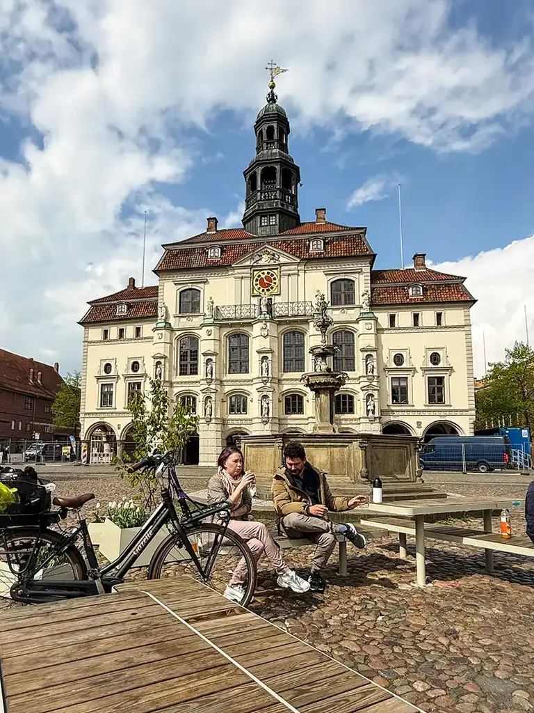 Die kleine Ferienwohnung in der Altstadt. Im historischen Gemäuer, viele hundert Jahre alt. Malerisches Fachwerk, liebenswerte Backsteingotik, bemalte Holzdecken – wie es sie auch in Pirna gibt. Dazu drei Kirchen, die St. Michaelis Kirche, die Nicolaikirche und St. Johannis. Vom Turm der zuletzt genannten ertönt allmorgendlich ein Choral über die Dächer der Hansestadt, in jede der vier Himmelsrichtungen geblasen auf dem Flügelhorn – wir haben das für euch überprüft. Sind durch die alten Gassen spaziert, an jedem Tag, haben den historischen Wasserturm erklommen und auf die Stadt geschaut, das Kloster Lüneburg besucht und sind landauf und landab geradelt, gerne und gerade auch an der Ilmenau und natürlich in der Heide.